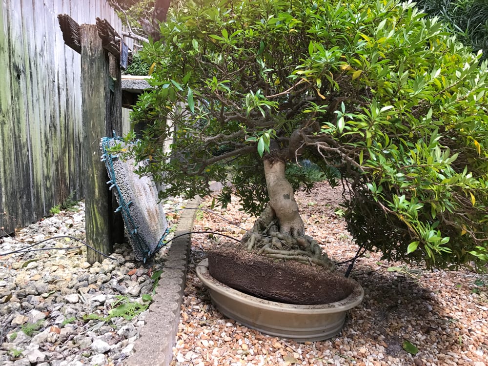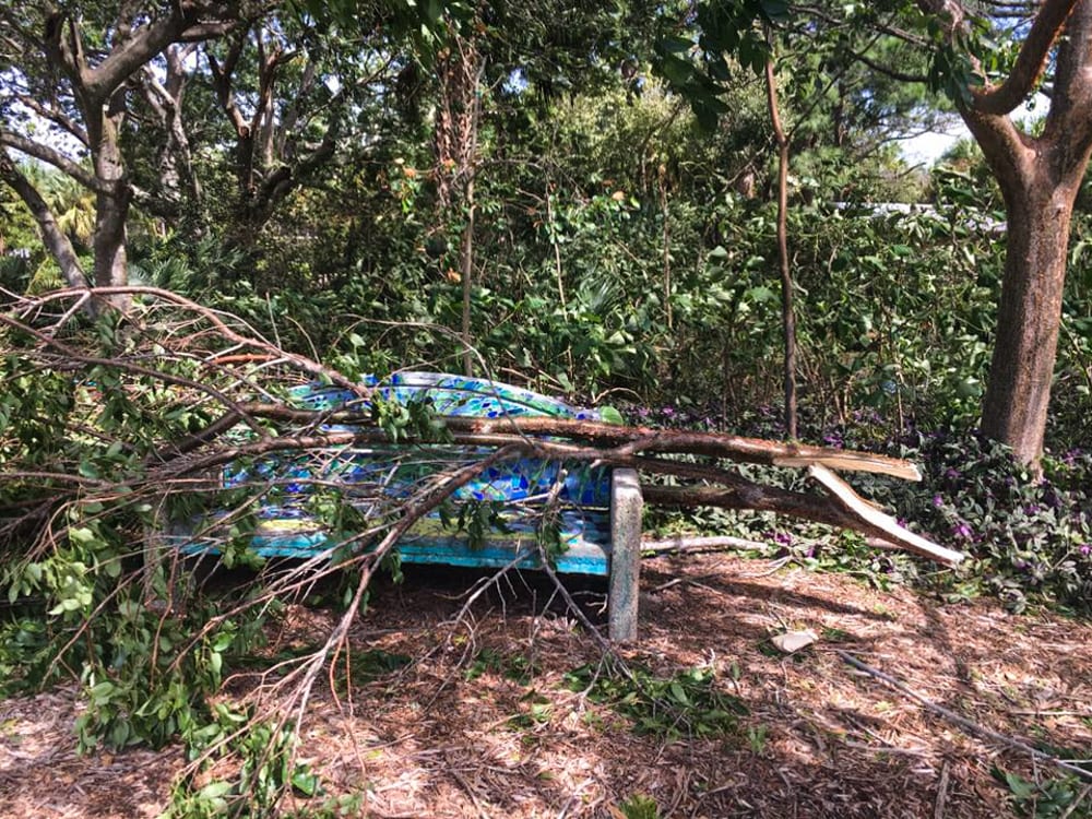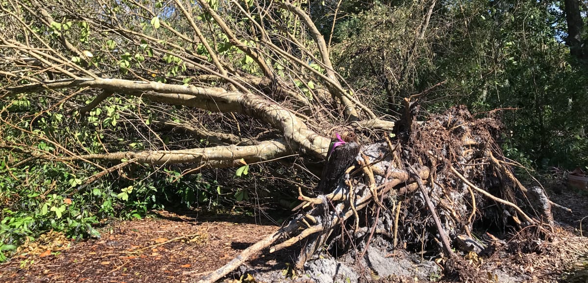 The silver lining is that our historic Heathcote House still stands. Regarding the James J. Smith Tropical Bonsai Collection, bonsai curator Seth Nelson and his friend Juan Andrade had moved many of the trees into the Pavilion and onto the ground away from falling limbs to prepare for the storm. It survived fairly well but will definitely require some tender loving care. The bonsai in the Japanese Garden did not fare as well and ended up with some toppled stanchions and broken pots.