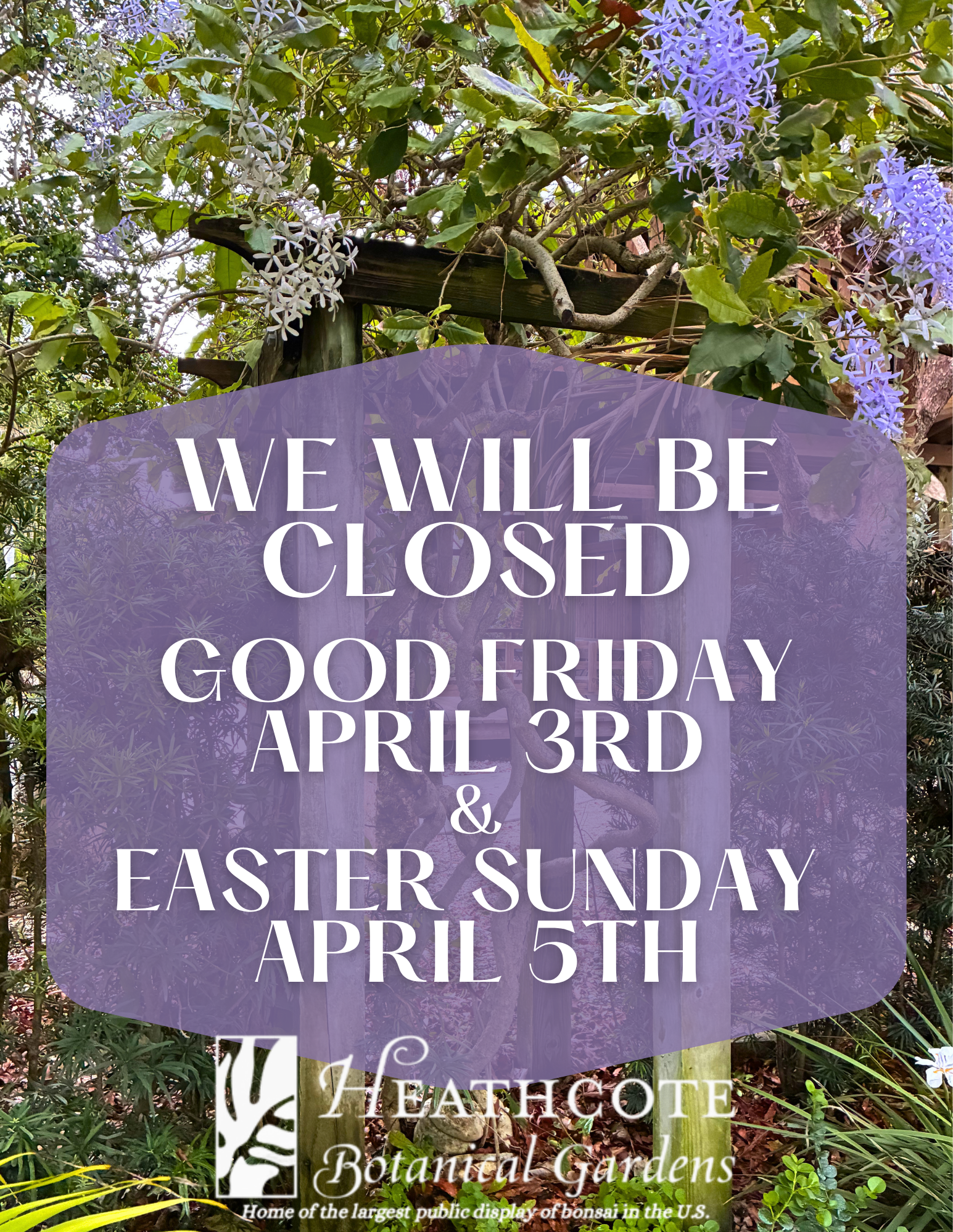 Please note our holiday schedule: closed on Good Friday, April 3, open Saturday, April 4, and closed again on Easter Sunday, April 5. As a reminder, the gardens are regularly closed on Mondays, so we’ll welcome everyone back Tuesday, April 7.